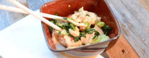 Agregá otra cucharada de aceite y salteá en el wok el Chingensai apenas medio minuto, volvé a incorporar el pescado y rectificá con un toque de nampla (es una salsa de anchoas fermentadas, podés usar salsa de soya). Ya está. Emplatá.