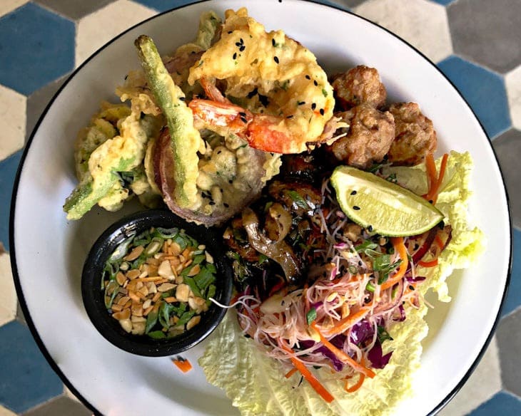 Asia: bolitas de cerdo, ensalada thai de fideos de arroz, akusay, salteado picante de hongos, salsa vietnamita, tempura de langostinos y verduras. (El tempura es hermoso, es crocante y suave al mismo tiempo y las verduras explotan de sabor en el paladar. La ensalada Thai va perfecto con el salteado de hongos y la salsa vietnamita, con maní. Aplausos de pie).