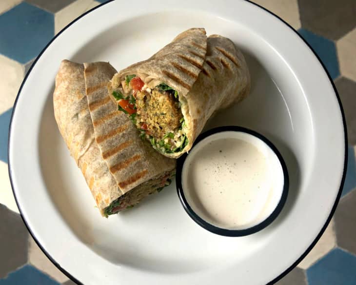 Árabe: viene con falafel, tabule, hummus, berenjenas asadas, morrones asados, rúcula, cebolla morada y salsa de yogurt.