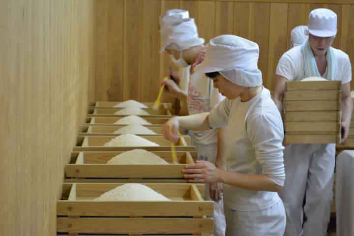 Luego de pulido, el arroz se remoja y se cocina al vapor. Pero, ¿cómo se fermenta si hasta ahora no tenemos azúcar, base total y absolutamente necesaria para el alimento de las levaduras? Es acá cuando aparece en escena el hongo koji, que a través de una reacción enzimática, sacarifica el almidón del arroz (es decir, lo convierte en azúcar).