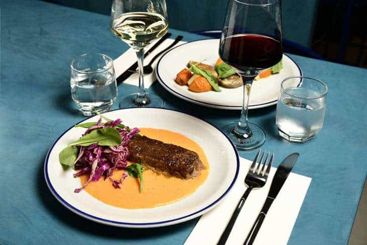 Los principales tienen opciones: podés pedir el asado de cocción larga, braseado durante cuatro horas y servido con una emulsión de salsa criolla y una ensalada de repollo colorado, o ir por algo más liviano, como gírgolas grilladas con ajilli (una salsa), calabaza asada y puerros confitados.
