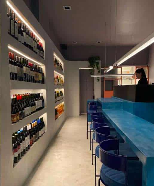 Las paredes pintadas de gris tienen estantes con vinos que van desde el piso hasta el techo, iluminados por luces led que acompañan el concepto y la intimidad e inspirados en las barras de tapas de Madrid.