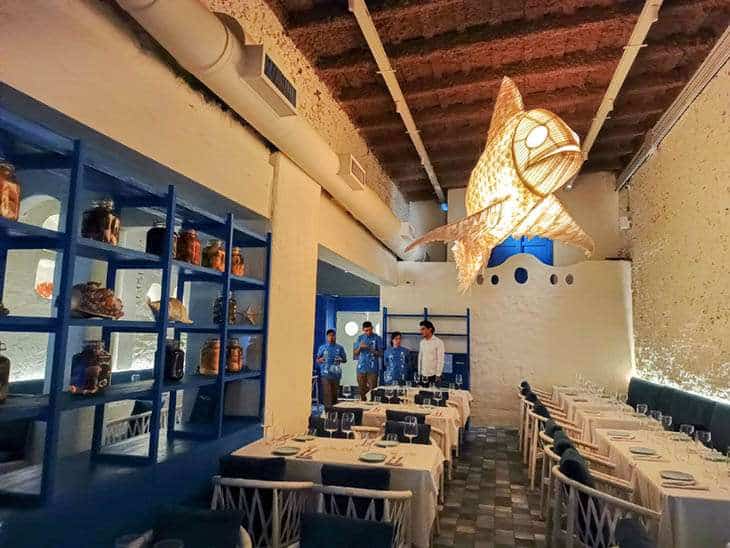Mesas blancas, almohadones azules, nichos en las paredes de piedra blanca con objetos marinos: caracoles, estrellas de mar, piedras.Cada detalle fue pensado con atención. Para la decoración se trajeron corales de Capri, toda la vajilla es española y respetan los colores y la morfología marina.