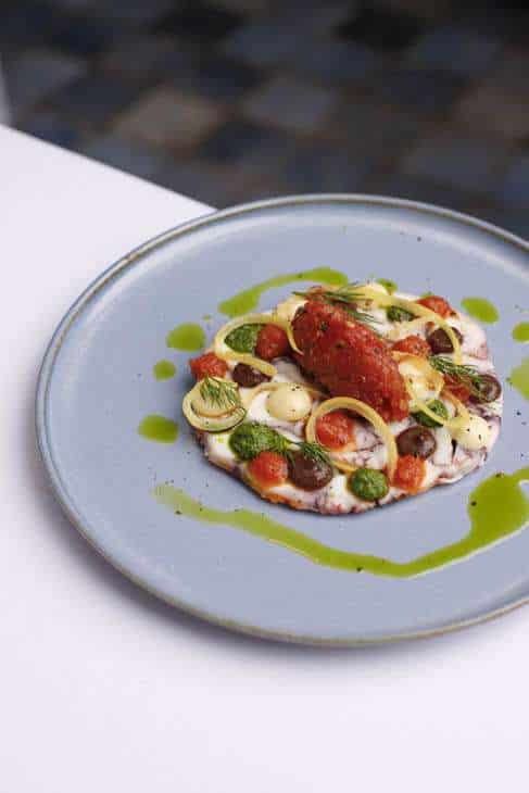 Los productos emblemáticos de la cocina del Mediterráneo son centrales en esta carta: aceite de oliva, tomates, limones, pesca fresca, especias y vegetales que el chef trata con respeto y cariño (aplicando técnicas francesas y de toda la vida, como la fermentación o los encurtidos).