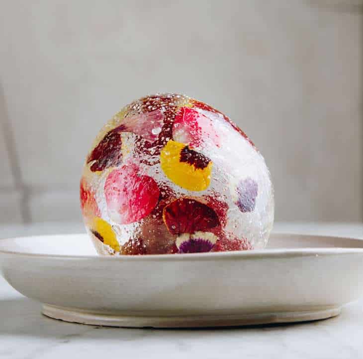 6) Postre Burbuja de caramelo. Crema de almendras, crujiente de flores y frambuesas congeladas. Menú naturaleza 2021.