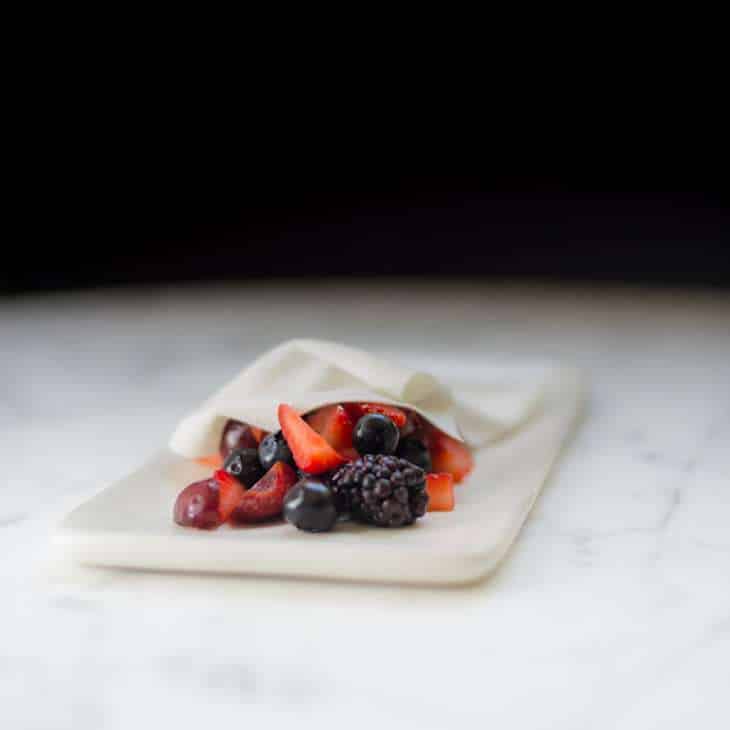4) La tortilla de maíz impresa con hierbas. Tortilla de flores, maíz, langostinos, calabaza, pepino y salsa roja. Los caballeros de la cama redonda, Gerado Sofovich. Carta verano 2020.