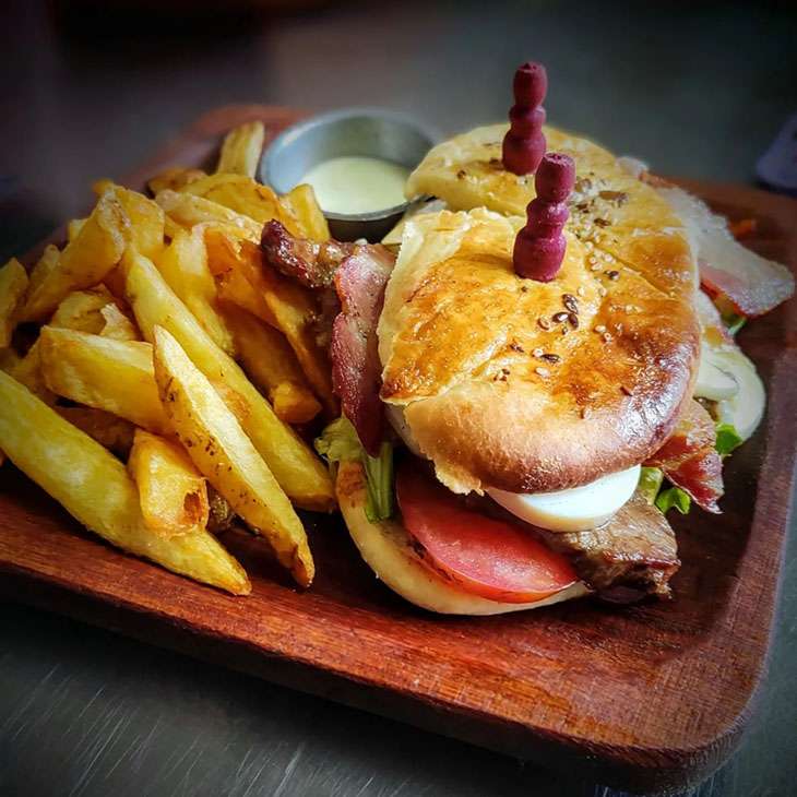 Ese sándwich de churrasquito de cuadril con lechuga, tomate, queso, panceta y rodajas de huevo duro, acompañado de papas fritas rústicas y alioli de berenjena, honra al país vecino y al guerrillero vuelto leyenda. Cuesta $7.200.
