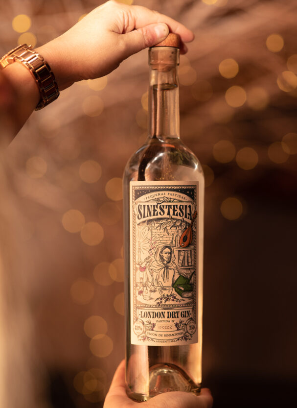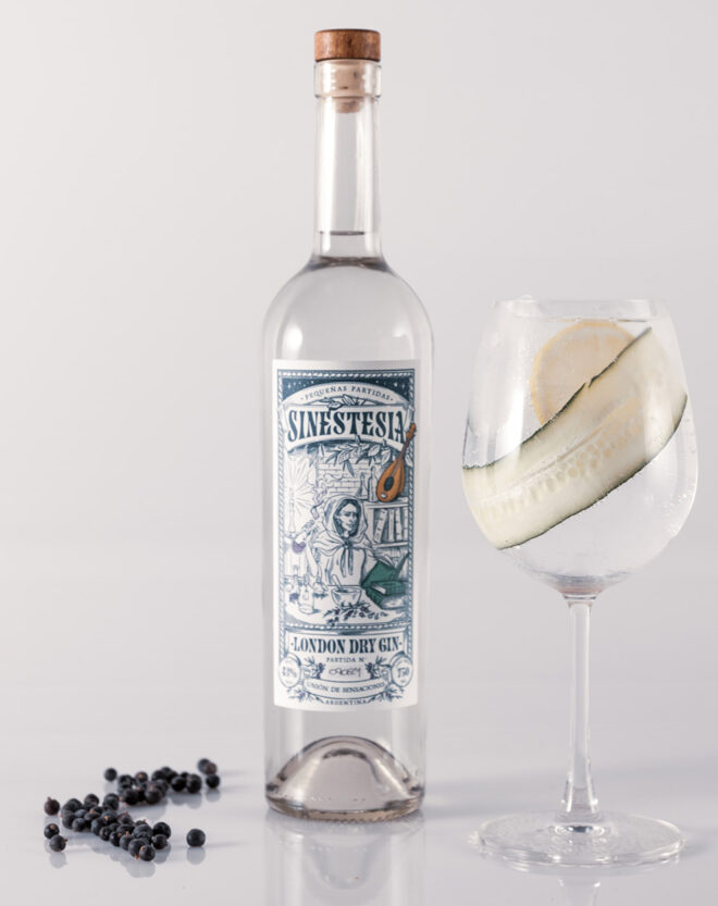 Sinestesia London Dry Gin es el resultado de varios años de pruebas para obtener la receta buscada -bayas de enebro, granos del paraíso, semillas de coriandro, raíz de Angélica, cáscara de limón, cáscara de naranja y romero-, una cuidadosa selección de botánicos provenientes de la Patagonia y de Inglaterra, entre otras procedencias, y un cuidado proceso de destilación
