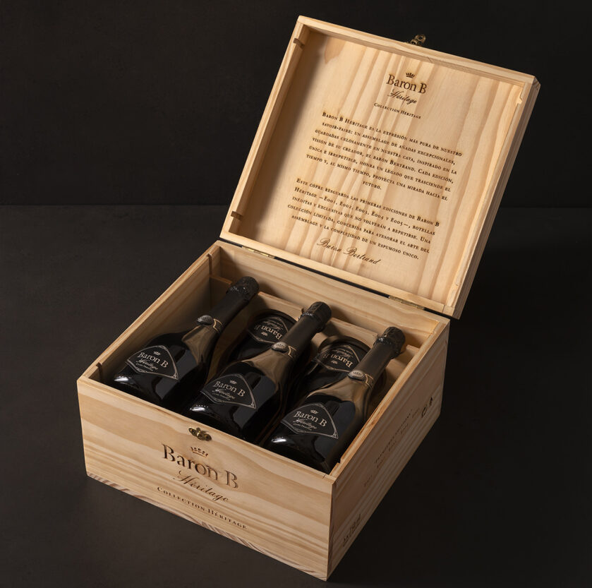 Desde su primera edición en 2021, Baron B Héritage se presenta cada año como una edición única e irrepetible. La Edición 001 combinó las cosechas excepcionales 2001, 2011 y 2015; la 002 destacó un Chardonnay 2014 y un Pinot Noir 2016; la 003 sorprendió con un 100% Chardonnay de tres añadas 2011, 2015 y 2019; y la 004 logró una armonía singular con cuatro millésimes: 2016, 2017, 2018 y 2019.