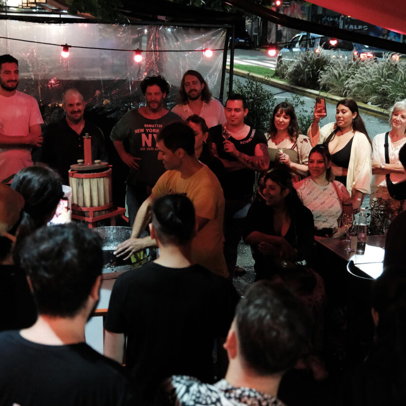 Con la ayuda de Martín Abenel, creador de Santé Vins, un proyecto vitivinícola ubicado a 20 kilómetros de Bahía Blanca y de baja intervención enológica, los amigos, clientes y vecinos vivieron la experiencia de hacer un vino, desde despalillar los racimos de uvas hasta dejar el mosto en el tanque de fermentación.