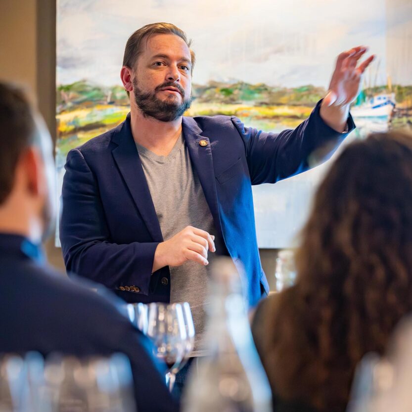 Dicta cursos de la Court of Master Sommeliers en Estados Unidos y en distintos países, participa en programas educativos, tutorías y entrenamientos, y acompaña a nuevas generaciones en el mismo camino exigente que él recorrió.